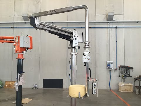Manipolatore pneumatico ATISmirus 100 a bracci rigidi completamente costruito in acciaio INOX per la presa e movimentazione di forme di formaggio in ambiente alimentare.